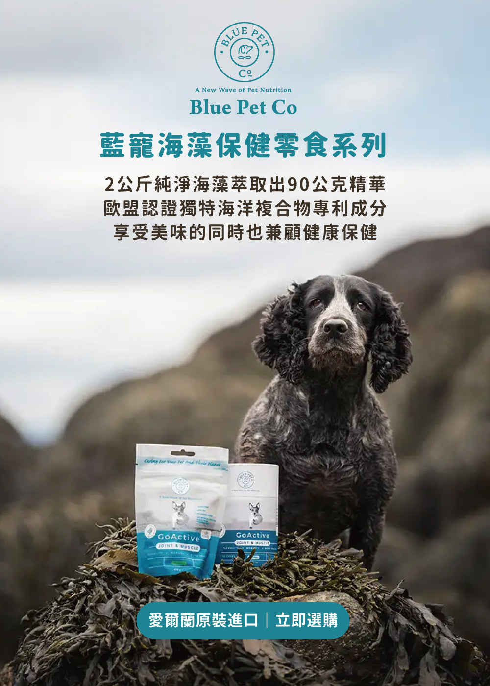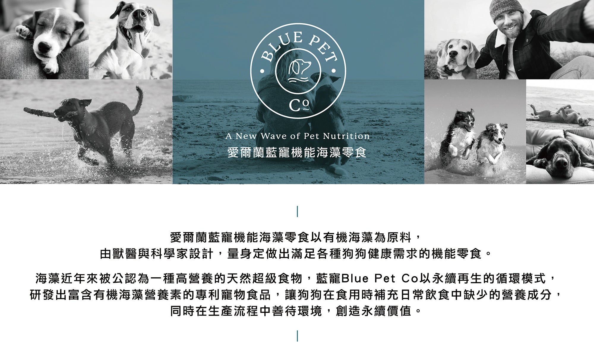 「藍寵機能Blue Pet Co.專為支持寵物的日常健康需求而設計。產品包含來自海洋的天然成分,提供多方面的保健支持,包括關節、皮毛和口腔。」