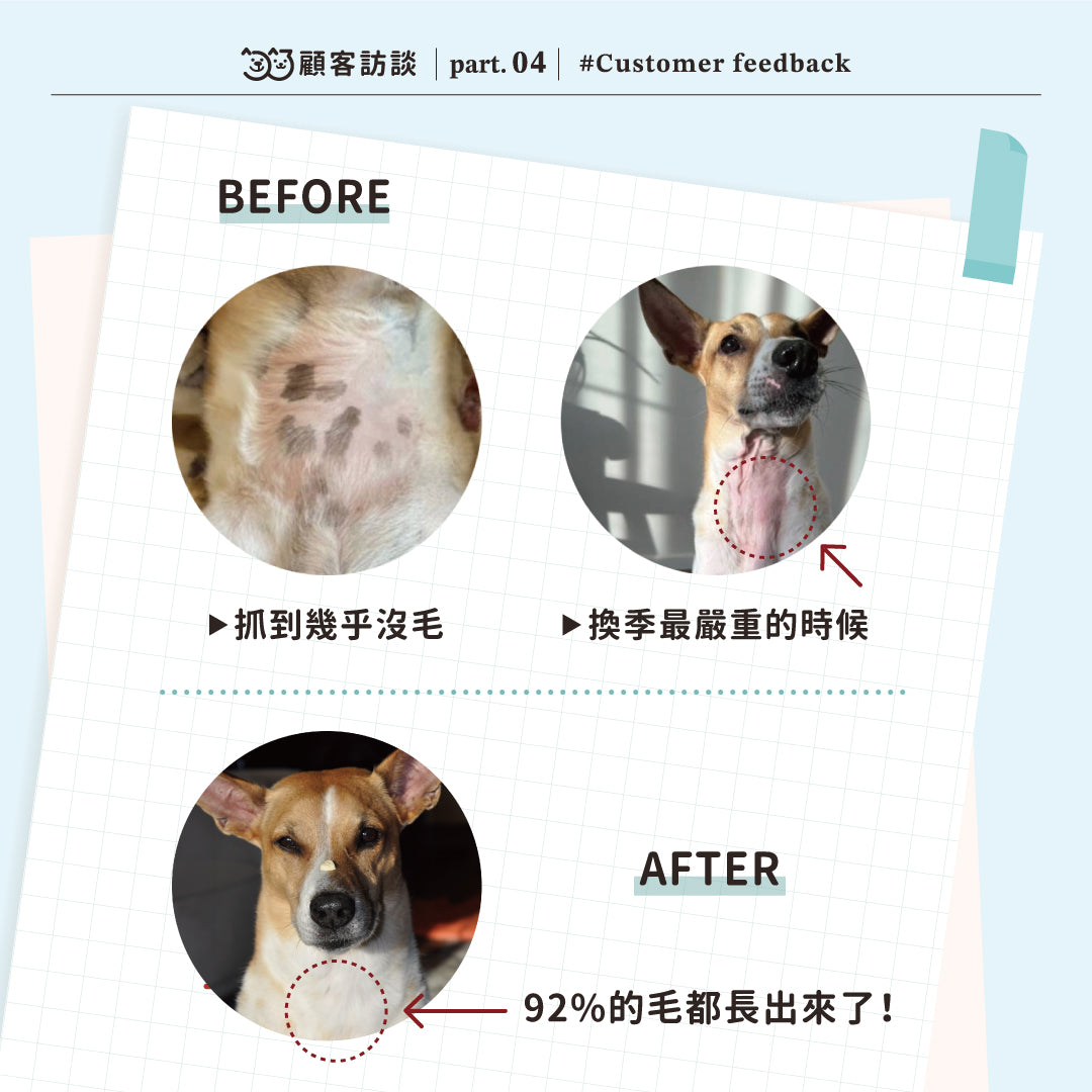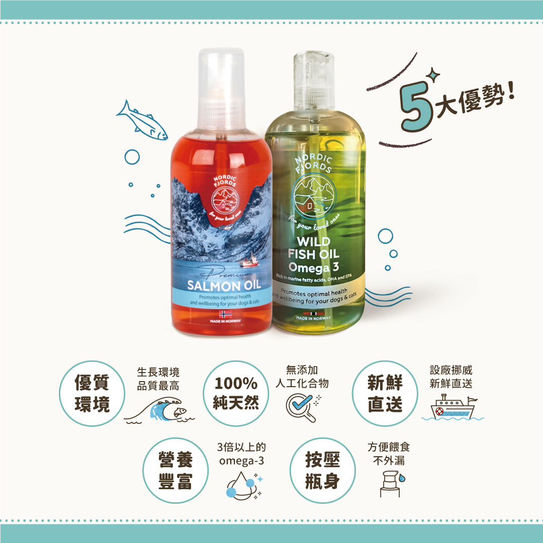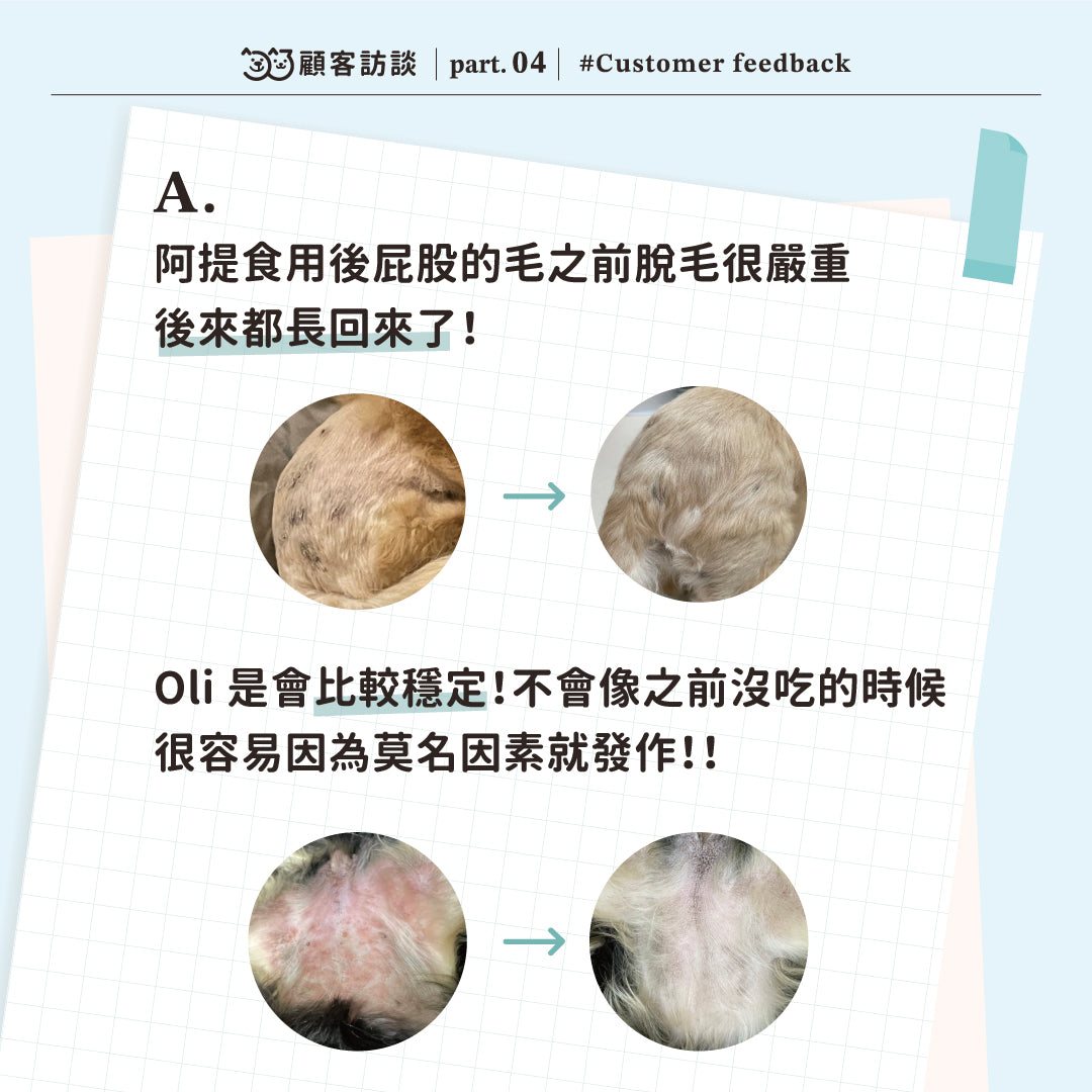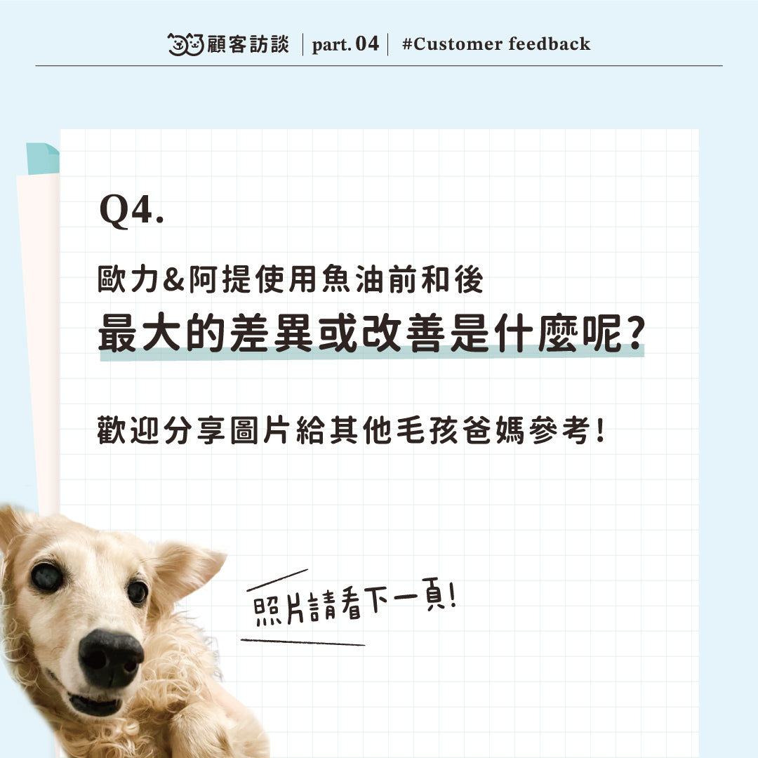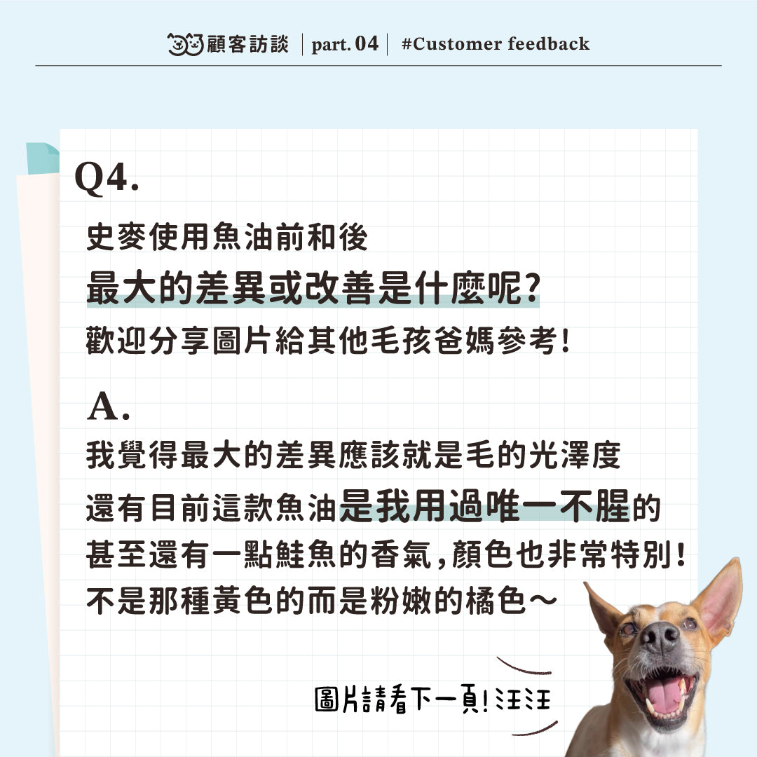 A: 我覺得最大的差異應該就是毛的光澤度,還有目前這款魚油是我用過唯一不腥的,甚至還有一點鮭魚的香氣,顏色也非常特別不是那種黃色的而是粉嫩的橘色~